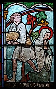 Though there is a vita that purports to be written by a contemporary, Genevieve's history cannot be separated from her hagiography. She was described as a peasant girl born in Nanterre to Severus (a Gallo-Roman) and Geroncia (Greek origins). On his way to Britain, Germanus of Auxerre stopped at Nanterre, and Genevieve confided to him that she wanted to live only for God. He encouraged her and at the age of fifteen, Genevieve became a nun. On the deaths of her parents, she went to live with her godmother Lutetia in Paris ("Lutetia" was the former name of the city of Paris, so this has symbolic weight). There the young woman became admired for her piety and devotion to works of charity, and practiced corporal austerities which included abstaining from meat and breaking her fast only twice in the week. "These mortifications she continued for over thirty years, till her ecclesiastical superiors thought it their duty to make her diminish her austerities."[4] She encountered opposition and criticism for her activities, both before and after she was again visited by Germanus from those who were jealous or considered her an impostor or hypocrite.