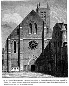 Clovis I founded an abbey where Genevieve might minister, and where she herself was later buried.[9] Under the care of the Benedictines, who established a monastery there, the church witnessed numerous miracles wrought at her tomb. As Genevieve was popularly venerated there, the church was rededicated in her name; people eventually enriched the church with their gifts. It was plundered by the Vikings in 847 and was partially rebuilt, but was completed only in 1177.