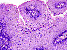 The diagnosis of genital warts is most often made visually, but may require confirmation by biopsy in some cases.[15] Smaller warts may occasionally be confused with molluscum contagiosum.[14] Genital warts, histopathologically, characteristically rise above the skin surface due to enlargement of the dermal papillae, have parakeratosis and the characteristic nuclear changes typical of HPV infections (nuclear enlargement with perinuclear clearing). DNA tests are available for diagnosis of high-risk HPV infections. Because genital warts are caused by low-risk HPV types, DNA tests cannot be used for diagnosis of genital warts or other low-risk HPV infections.[2]