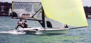 A gennaker is a sail that was developed around 1990. Used when sailing downwind, it is a cross between a genoa and a spinnaker. It is not symmetric like a true spinnaker but is asymmetric like a genoa, but the gennaker is not attached to the forestay like a jib or genoa. The gennaker is rigged like a spinnaker but the tack is fastened to the hull or to a bowsprit. It has greater camber than a genoa (but significantly less camber than a spinnaker). This is optimal for generating lift at larger angles of attack. An early form of gennaker was the "gollywhomper", used briefly in the 1870s.[1]