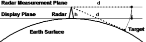The radar sensor is positioned on the earth surface with a height h above the ground. It measures the direct distance d to the target (and not e.g. the distance the target is away from the radar if one would move on the earth surface). This distance is then used in the display plane after adjustment to the current display zoom level by the radar scan converter (RSC). Now it has to be clarified how the radar video data is geo referenced. This basically means, that if we want to display a geographical real world object (like e.g. a light house) which is at the same real world position as the radar target, that it also shall appear at the same position in the display plane. This is realized by calculating the distance from the radar sensor to the respective real world object and use that distance in the display plane. The position of the real world object is typically given in geographical coordinates (latitude, longitude and height above the earth surface). In other words, using a radar projection with geographical data is done by simulating a radar measurement process with the real world objects and use the resulting range and azimuth in the display plane.