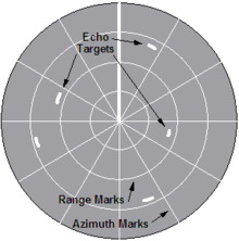 Bearing to the target is indicated by the target's angular position in relation to an imaginary line extending vertically from the sweep origin to the top of the scope. The top of the scope is either true north (when the indicator is operated in the true bearing mode) or ship's heading (when the indicator is operated in the relative bearing mode).