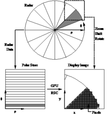 The radar supplies its measured data in polar coordinates (ρ,θ) directly from the rotating antenna. ρ defines the target/echo distance and θ the target angle in polar world coordinates. These data are measured, digitized and stored in a polar coordinate polar store or polar pixmap. The main RSC task is to convert these data to Cartesian (x, y) display coordinates, creating the necessary display pixels. The RSC process is influenced by the current zoom, shift and rotation settings defining which part of the 'world' shall be visible in the display image. As detailed later the RSC process also takes the currently used geographical projection into account when the radar video images are Geo Warped.