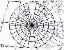 The second picture to the right shows an example radar projection with the center of projection (COP) at latitude 50.0° and longitude 0.0° which is also the radar position. The dashed lines are the equal-latitude and equal-longitude lines on top of the background map. The solid lines show equal-range and equal-azimuth with the respect to the radar position. It is a feature of the radar projection that equal-range lines are circles and equal-azimuth lines are straight lines. This is necessary to display radar video consistently with other map data when using a radar projection where the projection center has to be the radar position.