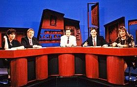 Geoffrey Perkins hosting Channel 4 panel game Don't Quote Me, 1990 | |