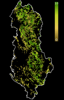 Forests and woodlands are the most widespread terrestrial ecosystem in Albania. That of the northern edge of the country has an affinity for those of Continental Europe, while those of the southern edge refer to the affinity with that of the Mediterranean Basin.[33] They are substantial because they provide shelter for a vast array of rare and endangered species of animals, among others the brown bear, Balkan lynx, grey wolf, golden jackal, Egyptian vulture and golden eagle. Albania had a 2018 Forest Landscape Integrity Index mean score of 6.77/10, ranking it 64th globally out of 172 countries.[34]