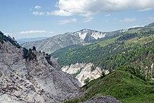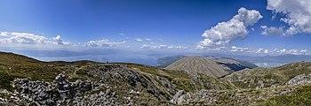 The Korab Mountains are certainly the most striking feature of the physical geography of the region. They offer simultaneously the highest mountain of the country, the Mount Korab.[45] The mountains extends over 40 kilometres and covers an area of 560 square kilometres.[46] Between the valleys of Shkumbin and Devoll rise the mountains that constitute to the Valamara Mountains, while farther north stretches the connected mountain massifs of Shebenik and Jabllanicë.[47]
