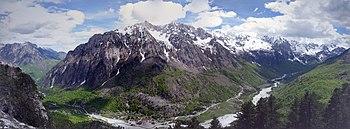 The northern mountain range is the most mountainous region in the country and its physical geography and shape is distinguished by the convergence of two distinct geological regions, the Albanian Alps and Mirdita Highlands.[43] A dominant feature of the region's landscape is the presence of several u-shaped valleys, such as the Valley of Valbonë, formed by the process of glaciation.