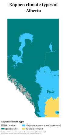 Northern Alberta is the coldest region of Alberta, with most places having a subarctic climate (Köppen climate classification Dfc) though some areas in the south of this region, as well as much of the Peace River Country, have a humid continental climate (Köppen climate classification Dfb).[2] Winters in Northern Alberta are long, very cold, and harsh, while summers are short and warm. Precipitation levels are generally lower than Central Alberta and similar to Southern Alberta, but lower evapotranspiration results in there being greater effective precipitation than Southern Alberta. Natural vegetation in Northern Alberta consists primarily of mixed and coniferous taiga, with aspen parkland in the Peace River Country.[3] With the exception of the Peace River Country, this region is generally quite poor for agriculture.