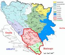 Bosnia and Herzegovina is located in Southeastern Europe, in the western Balkans. It has a 932 km (579 mi) border with Croatia to the north and southwest, a 357 km (222 mi) border with Serbia to the east, and a 249 km (155 mi) border with Montenegro to the southeast.[1] It borders the Adriatic Sea along its 20 km (12.42 mi) coastline.