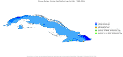 Most of Cuba has a tropical savanna climate (Aw) according to the Köppen Climate classification, though some areas also have a tropical monsoon climate and a tropical rainforest climate, with a hot semi-arid climate in the Guantánamo Bay area. In most areas, the dry season lasts from November to April and the rainy season from May to October.