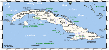 Cuba is located 77 km (48 mi) west of Haiti across the Windward Passage, 21 km (13 mi) south of The Bahamas (Cay Lobos), 150 km (93 mi) south of the United States (Key West, Florida), 210 km (130 mi) east of Mexico, and 140 km (87 mi) north of Jamaica. It was made in three stages.[2]