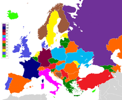 | 1 | Denmark, Ireland, Monaco, Portugal, San Marino, United Kingdom, Vatican City |