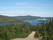 The interior lake plateau is dominated by undulating hilly terrain with valley to top height differences of 100 or less and occasionally up to 200 m.[1][6] Only the area around the lakes Pielinen and Päijänne stand with a subtly more pronounced relief.[6] The relief of the interior lake plateau bears some resemblance to the Swedish Norrland terrain.[1] Upland Finland and areas higher than 200 m are found mostly in the north and east of the country. A limited number of hills and mountains exceed 500 m in height in these regions.[6] Inselberg plains are common in the northern half of the country.[7] In the far north hills reach 200 to 400 m and the landscape is a förfjäll (fore-fell).[1] Only the extreme northwest contains a more dramatic mountain landscape.[8]