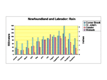 Monthly average temperatures, rainfall and snowfall for four communities are shown in the attached graphs. St. John's represents the east coast, Gander the interior of the island, Corner Brook the west coast of the island and Wabush the interior of Labrador. The detailed information and information for 73 communities in the province is available from a government website.[33] The data used in making the graphs is the average taken over thirty years. Error bars on the temperature graph indicate the range of daytime highs and night time lows. Snowfall is the total amount which fell during the month, not the amount accumulated on the ground. This distinction is particularly important for St. John's where a heavy snowfall can be followed by rain so that no snow remains on the ground.