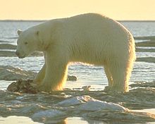 The tundra is a sub-Arctic zone with long, cold winters and short, warm summers.[5][29] Precipitation is low. Soil a meter below ground and deeper is permanently frozen (permafrost), which does not allow water to drain easily through the soil, so it collects in shallow pools. Trees and shrubs are stunted since their roots cannot grow into the permafrost. Low shrubs, lichens, mosses, and small herbaceous plants are found instead. The most common mammals on the tundra are the barren-ground caribou, Arctic wolf, Arctic fox, Arctic hare, lemmings, and voles. Occasional sightings of muskoxen have been made near Cape Chidley,[30] Labrador's most northerly point. The polar bear is the dominant carnivore of the tundra, but is an occasional visitor to coastal Newfoundland, especially in the spring. Many birds migrate to Labrador in spring to lay their eggs and raise their young before returning south for the winter, including the common eider, harlequin duck,[31] Common redpoll and American pipit.[32] The Labrador tundra is also permanent home to ptarmigan.