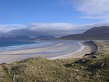Mainland Scotland has 6,160 miles (9,910 km) of coastline. Including the numerous islands, this increases to some 11,602 miles (18,672 km).[13] The west coast in particular is heavily indented, with long promontories separated by fjordlike sea lochs. The east coast is more regular, with a series of large estuarine inlets, or firths, and long sandy beaches, for example at Aberdeen. Parts of the Scottish coastline consist of a machair formation, a dune pasture land formed as sea levels subsided.[14]