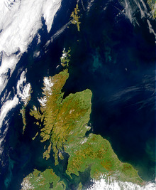 Scotland's only land border is with England, which runs for 60 miles (97 km) in a northeasterly direction from the Solway Firth in the west to the North Sea on the east coast.[2] Separated by the North Channel, the island of Ireland lies 13 miles (21 km) from Mull of Kintyre on the Scottish mainland.[3] Norway is located 190 miles (310 km) to the northeast of Scotland across the North Sea. The Atlantic Ocean, which fringes the coastline of western and northern Scotland and its islands, influences the temperate, maritime climate of the country.[4]