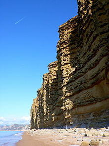 The lowest part of the Upper Lias, formed around 182 Ma, is known as the junction bed and despite representing 3,000,000 years, is only 0.6 to 1.5 metres thick, where it can be seen at Eype Mouth.[20] In Yorkshire the equivalent strata is around 100 metres thick, suggesting that Dorset remained underwater much longer and was robbed of supplies of sand and clay. This bed is composed of fine-grained limestones from white to pale pink in colour.[20] The clearest evidence of fault activity exists in a section of cliff between West Bay and Eype Mouth, where the junction bed thickens in a section of steps, and fractures in the rock contain sediment from the ocean bed which, most likely, was sucked in as the cracks opened.[20]