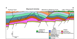 The Weymouth Anticline has a west–east trending axis and plunges to the east. Strata beneath the Upper Triassic halite are unfolded indicating that the salt is acting as a decollement. The anticline is a result of inversion along the Abbotsbury–Ridgeway Fault, although it has been suggested that it developed by the tightening of an earlier rollover anticline, formed during an earlier extensional phase, due to the soft-linked nature of the faulting.[76]