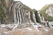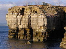 The Portland sands were created in a deep marine environment whereas the Portland stone was a near-shore deposit.[37] The lower Portland Sand formation, usually greyish blue in colour, consists of dolomite beds best viewed on the West Weares, Gad Cliff and Hounstout. The overlying Portland stone is a distinctive white oolite containing thick shelled fossils and marine algae.[38] The marine algae which formed large reefs, is responsible for the occasional stacked and arched bands in the formation and is best viewed in the Roach, an extremely fossiliferous limestone confined to the north of Isle of Portland.[39]