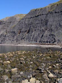 Formed somewhere between 185 Ma and 204 Ma, in what was then a shallow marine environment, the Lower Lias Lias is composed of Blue Lias, Black Ven Marls and Green Ammonite Beds (Charmouth Mudstone Formation). Mostly covered by lush vegetation, it forms the floor of Marshwood Vale in the west of Dorset and can be seen in stream beds, where the land has been excavated, and along the coast to the west of Seatown. The sides of the vale are mainly made from the clays and sands of the upper and lower Lias while younger strata from the Cretaceous Period (145–66 Ma), crown the higher points.[12] The Blue Lias is the lowest of the Liassic stratum and where it is visible on the coast near Lyme Regis is layered with hard limestone and oil-rich shale.[13] The iron pyrites in the clay can heat up when exposed to the air and occasionally ignite the shales.[14]