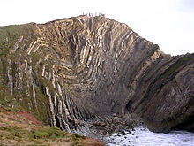 The collision of the African and Eurasian plates that occurred around this time caused a violent uplift in the south of the county, the results of which can be seen clearly at Stair Hole, where the strata run almost vertically.[67] Further, but less dramatic folding and uplift, along the county's subsurface faults, coupled with continuing erosion of Jurassic and Cretaceous sediments, created Dorset's modern landscape and drainage patterns.[68]