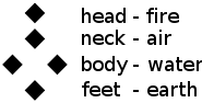Each of the figures is composed of four lines, each line containing either one or two points. Each line represents one of the four classical elements: from top to bottom, the lines represent fire, air, water, and earth. When a line has a single point, the element is said to be active; otherwise, with two points, the element is passive. Because there are four lines, and since each line can be either active or passive, there are 24, or 16, different figures. The different combinations of elements yields different representations or manifestations of the figure's energy.