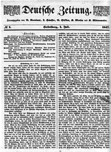 The same year brought his expulsion from Göttingen in consequence of his protest, in conjunction with six of his colleagues, against the violation of the constitution by Ernest Augustus, king of Hanover and duke of Cumberland. After several years in Heidelberg, Darmstadt and Rome, he settled permanently in Heidelberg, where, in 1844, he was appointed honorary professor. He zealously took up in the following year the cause of the German Catholics, hoping it would lead to a union of all the Christian confessions, and to the establishment of a national church. He also came forward in 1846 as a patriotic champion of the Schleswig-Holsteiners, and when, in 1847, King Frederick William IV promulgated the royal decree for summoning the so-called United Diet (German: Vereinigter Landtag), Gervinus hoped that this event would form the basis of the constitutional development of the largest German state. He founded, together with some other patriotic scholars, the Deutsche Zeitung, which certainly was one of the best-written political journals ever published in Germany. His appearance in the political arena secured his election as deputy for the Prussian province of Saxony to the National Assembly sitting in 1848 at Frankfort. Disgusted with the failure of that body, he retired from all active political life.[1]