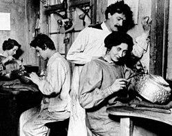 Jensen's training in metalsmithing along with his education in the fine arts allowed him to combine the two disciplines and revive the tradition of the artist craftsman. Soon, the beauty and quality of his Art Nouveau creations caught the eye of the public and his success was assured. The Copenhagen quarters were greatly expanded and before the end of the 1920s, Jensen had opened retail in Berlin (1909), London (1921), and New York City (1924).[4] In 1930, Adda Husted Andersen worked for Jensen in New York City, enameling homewares.[5]