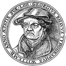 Georg Rhau (Rhaw) (1488 – 6 August 1548) was a German publisher and composer.[1] He was one of the most significant music printers in Germany in the first half of the 16th century, during the early period of the Protestant Reformation. He was principally active in Wittenberg, Saxony, the town where Martin Luther is said to have nailed the Ninety-five Theses to the door of the Castle Church, initiating the Reformation. Rhau's support as a printer was critical to Luther's success.[2]
