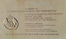 At the outbreak of the First World War, Butterworth, together with several of his friends, including Geoffrey Toye and R. O. Morris, joined the British Army as a private in the Duke of Cornwall's Light Infantry, but he soon accepted a commission as a subaltern (2nd Lieutenant) in the 13th Battalion Durham Light Infantry, and he was later temporarily promoted to lieutenant.[2] He was known as G. S. Kaye-Butterworth in the Army.[2] Butterworth's letters are full of admiration for the ordinary miners of County Durham who served in his platoon. As part of 23rd Division, the 13th DLI was sent into action to capture the western approaches of the village of Contalmaison on The Somme. Butterworth and his men succeeded in capturing a series of trenches near Pozières on 16–17 July 1916, the traces of which can still be found within a small wood. Butterworth was slightly wounded in the action. For his action Temporary Lt. George Butterworth, aged 31, was awarded the Military Cross, gazetted 25 August 1916, though he did not live to receive it.[8]