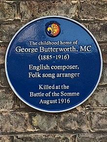 Butterworth was born in Paddington, London.[1] Soon after his birth, his family moved to York so that his father Sir Alexander Kaye Butterworth could take up an appointment as general manager of the North Eastern Railway, which was based there. [2] Their home was at Riseholme, a house on Driffield Terrace, which later became part of the Mount School. In 2016, the centenary year of his death on the Somme, biographer Anthony Murphy unveiled on behalf of the York Civic Trust a blue plaque to his memory at College House, Driffield Terrace, part of the Mount School.