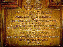 Butterworth's body was never recovered (although his unidentified remains may well lie at nearby Pozières Memorial, a Commonwealth War Graves Commission cemetery), and his name appears on the Thiepval Memorial.[2] George Butterworth's The Banks of Green Willow has become synonymous for some with the sacrifice of his generation and has been seen by some as an anthem for all 'Unknown Soldiers'. Sir Alexander Butterworth erected a plaque at St Mary's Priory Church, Deerhurst, Gloucestershire in memory of his son and of his nephew, Hugh, who died at Loos in 1915. (The Rev. George Butterworth, the composer's grandfather, had been vicar of St Mary's in the previous century.[2]) Sir Alexander also arranged the printing in 1918 of a memorial volume in his son's memory. Almost all Butterworth's manuscripts were left to Vaughan Williams, after whose death Ursula Vaughan Williams lodged the original works in the Bodleian, Oxford, and the folk song collection with the EFDSS.[2]
