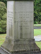 In 1872, George Atkinson left his church to begin missionary work.[1] By 1880 he was named as Superintendent of Missions of Congregational Churches of Oregon and Washington Territory.[1] With this he traveled throughout the region, and is credited with coining the phrase "Inland Empire" to describe eastern regions of Oregon and Washington.[1] In 1885, his district was split, and Atkinson remained in charge of the Oregon section until his death in Portland on February 25, 1889.[1] He was buried at River View Cemetery in Portland.[8]