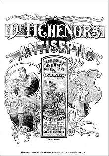 Tichenor developed his antiseptic formula in Canton, Mississippi, and thereafter practiced medicine in Baton Rouge, Louisiana, from 1869 to 1887. He started bottling Dr. Tichenor's Patent Medicine in New Orleans; the formula, consisting of alcohol, oil of peppermint, and arnica, was originally marketed as useful for a wide variety of complaints for both internal and external use for man and animal. A patent was registered in 1882.[3] The company producing this liquid was incorporated in 1905 and is still in existence, though the recommended uses are now more modest: principally as a mouthwash and topical antiseptic.