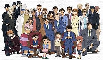 Many of the main characters as they appear in the anime. The top row from left to right: Vodka, Vermouth, Korn, Gin, Kaito Kid, Herschel Agasa (Hiroshi Agasa), Harley Hartwell (Heiji Hattori), Richard Moore (Kogoro Mori) Joseph Meguire (Juzo Megure), Masumi Sera, Wataru Takagi (Harry Wilder), Miwako Sato (Michele Simone), Booker Kudo (Yusaku Kudo), Vivian Kudo (Yukiko Kudo), Toru Amuro, Jodie Starling, James Black, Shuichi Akai, and Subaru Okiya (Shuichi Akai in disguise). Bottom row from left to right: Chianti, Kazuya Toyama, George Kaminski (Genta Kojima), Conan Edogawa, Amy Yeager (Ayumi Yoshida), Rachel Moore (Ran Mori), Serena Sebastian (Sonoko Suzuki), Mitch Tennison (Mitsuhiko Tsuburaya), Jimmy Kudo (Shinichi Kudo), Anita Hailey (Ai Haibara), and André Camel.