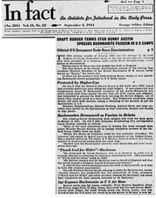 In Fact immediately attracted the attention of government authorities. President Roosevelt ordered an FBI investigation of Seldes and In Fact in 1940.[30] Articles claiming that the FBI was infiltrating unions and monitoring union activities resulted in FBI surveillance of Seldes and his publication. J. Edgar Hoover sent Seldes a 15-page letter denying such FBI activities.[31] The FBI subsequently questioned In Fact subscribers, particularly servicemen and women, and had US postal officials reporting to the FBI on Seldes' mail correspondence. In Fact lost many of its subscribers in the late 1940s. Seldes later claimed that his critical coverage of Yugoslavia got the publication banned from Communist Party bookstores. The political climate discouraged subscriptions on the part of less ideologically committed readers as well.[31] In Fact ceased publication in 1950. I. F. Stone's Weekly, which started publication in 1953, took In Fact as its model.[9]