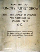 In 1962 he campaigned for an inscribed plaque commemorating Samuel Pepys to be placed was on the wall of St. Paul's Church in Covent Garden. In his diary in 1662 Pepys made the first mention of a Punch and Judy show in England at Covent Garden. In 1987 at the 325th anniversary of Pepys’ sighting Speaight dressed as Pepys and took part in the grand procession around Covent Garden complete with quill and diary in his hand.[1][3]