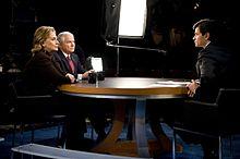 On April 16, 2008, Stephanopoulos co-moderated, with Charles Gibson, the twenty-first, and ultimately final, Democratic Party presidential debate between Illinois Senator Barack Obama and New York Senator Hillary Clinton for the 2008 election cycle. While the debate received record ratings, the co-moderators were heavily criticized for focusing most of the first hour of the debate on controversies that occurred during the campaign rather than issues such as the economy and the Iraq War. Stephanopoulos acknowledged the legitimacy of the concerns over the order of the questions,[24] but said they were issues in the campaign that had not been covered in previous debates.[25] ABC had sought out a woman who opposed Obama and aired a video of her asking a trivial question, repeated by Stephanopolous, about why Obama wasn't wearing a flag pin. The question brought widespread criticism from the media.[26][27]