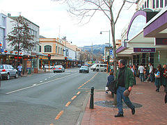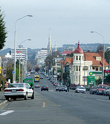 In the settlement's early days, Bell Hill proved a major obstacle to travel south of the city centre, and major excavation work was carried out to provide access to the south. A cutting was made in the hill in 1858, and during the 1860s the hill was lowered by some 14 metres (46 ft), much of the rubble forming the start of the Southern Endowment, a large area of land reclaimed from the Otago Harbour to the southeast of the city centre.[1] Once the cut was completed, Princes Street quickly became the city's central business district, especially the area between the original docks (now the Exchange area) and around the cutting. Increased development to the north of the Octagon saw a slow but inexorable drift of the city's business heart to George Street, a trend possibly accelerated by the growth of the city's tertiary education sector, especially the University of Otago. Much of the city's economic and retail heart now lies between the University and the Octagon in the first few blocks of George Street and in the streets which cross it (notably Hanover Street and St. Andrew Street), and the two roads which run parallel to either side of George Street (Filleul Street to the west, and Great King Street to the east).