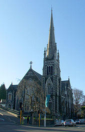 Numerous other buildings on George Street also have Historic Places Trust protection, notably Knox Church (Category I),[4] Other buildings with Category I or II protection include commercial buildings at 207,[5] 310,[6] 398,[7] and 412a George Street;[8] a hotel at 619 George Street;[9] and residential properties at 504 (now used commercially),[10] 521,[11] 603[12] 607,[13] 613[14] 657[15] 1008,[16] and 1014 George Street,[17] as well as semi-detached houses at 637[18] and 641 George Street[19] and a terraced block, 1046–1056 George Street.[20] The former Bank of New Zealand building (now a real estate agent's premises), adjoining George Street close to Knox Church on the corner of London and Pitt Street, is also a Category II building.[21]