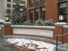 Law classes resumed in 1865 in the Old Trinity Episcopal Church, and the school graduated its first class of 60 students in 1867.[1] The Master of Laws degree program was adopted by the school in 1897.[1] In 1900, the school was one of the founding members of the Association of American Law Schools.[1] In 1954, it merged with National University School of Law of Washington.[1] The law school operated under the name National Law Center for the 37 years from 1959 to 1996, when it was renamed the George Washington University Law School.[13]