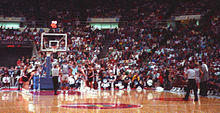 In the 1994–95 season, newcomer Allen Iverson won the Big East Rookie of the Year award.[18] During his two years at Georgetown, Iverson scored a Georgetown-record 22.9 points per game.[19] In 1995–96, he propelled the Hoyas to a major upset over the Connecticut Huskies during the season, but Georgetown later lost to the Huskies in the final seconds of that year's Big East Tournament.[14] In the NCAA Tournament, the Hoyas came up one game short of the Final Four, losing to the University of Massachusetts, the top ranked team in the country.