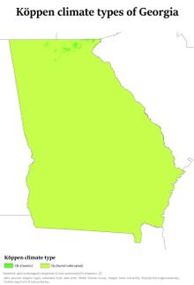 The majority of the state is primarily a humid subtropical climate. Hot and humid summers are typical, except at the highest elevations. The entire state, including the North Georgia mountains, receives moderate to heavy precipitation, which varies from 45 inches (1143 mm) in central Georgia[27] to approximately 75 inches (1905 mm) around the northeast part of the state.[28] The degree to which the weather of a certain region of Georgia is subtropical depends on the latitude, its proximity to the Atlantic Ocean or Gulf of Mexico, and the elevation. The latter factor is felt chiefly in the mountainous areas of the northern part of the state, which are farther away from the ocean and can be 4500 feet (1350 m) above sea level. The USDA plant hardiness zones for Georgia range from zone 6b (no colder than −5 °F (−21 °C) ) in the Blue Ridge Mountains to zone 8b (no colder than 15 °F (−9 °C) ) along the Atlantic coast and Florida border.[29]