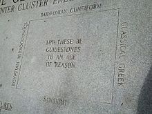 A message consisting of a set of ten guidelines or principles is engraved on the Georgia Guidestones[8] in eight different languages, one language on each face of the four large upright stones. Moving clockwise around the structure from due north, these languages are: English, Spanish, Swahili, Hindi, Hebrew, Arabic, Traditional Chinese, and Russian.