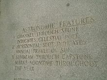 The four outer stones are oriented to mark the limits of the 18.6 year lunar declination cycle.[9] The center column features a hole drilled at an angle from one side to the other, through which can be seen the North Star, a star whose position changes only very gradually over time. The same pillar has a slot carved through it which is aligned with the Sun's solstices and equinoxes. A 7&fras1;8in (22 mm) aperture in the capstone allows a ray of sun to pass through at noon each day, shining a beam on the center stone indicating the day of the year.[2]