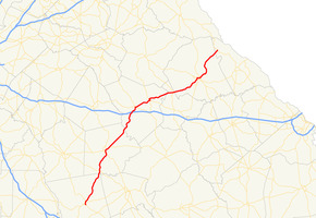 SR 44 begins at an intersection with US 129/SR 18/SR 22 in Gray, in Jones County. At this intersection, SR 44 begins, concurrent with US 129. The two routes head north-northeast out of town. They begin to skirt along the eastern edge of Oconee National Forest. They enter the forest very briefly before skirting the eastern edge again. They have yet another brief entrance into the forest and yet again skirt along the edge. After that, they cross over Cedar Creek into Putnam County and enter the forest proper. In Resseaus Crossroads, they intersect SR 212 (Kinderhook Road). A short distance later, they cross over Murder Creek. A few miles later, they cross over Little River and leave the forest. Approximately 1.5 miles (2.4 km) later, they enter Eatonton. They intersect US 441/SR 24 (Milledgeville Road). At this intersection, US 129 splits off to follow US 441/SR 24 north, while SR 44 continues to head north-northeast on Oak Street, now concurrent with US 129 Business/US 441 Business/SR 24 Business. The four routes curve to the north-northwest and pass the Uncle Remus Golf Course. They curve to the northeast before curving again to the north-northwest. At East Sumter Street, SR 16/SR 44 split off to the northeast. Next to Putnam General Hospital, the two routes diverge. About 1 mile (1.6 km) later, SR 44 leaves town. It crosses over Lick Creek on the Tom C. Hallman Memorial Bridge. A short distance later is a bridge over the Oconee River into Greene County. To the northeast is an interchange with Interstate 20 (I-20) in Greensboro. In the main part of town, it intersects US 278/SR 12/ 15 (West Broad Street). The four highways head concurrent to the east. A few blocks later, SR 15 (Siloam Road) splits off to the southeast. Just northeast of town, they pass Greene County Regional Airport and head into Union Point. At Athens Highway, SR 44/SR 77 split off to the north-northwest and curve to the northwest. At Washington Highway, SR 44 splits off to the northeast and then curves to a mostly eastern routing. It has crossings of the South Fork Little River and North Fork Little River. The latter one marks the Greene–Taliaferro county line. A little while later, SR 44 has a second intersection with SR 22. Almost immediately, it enters Wilkes County. Just before entering Washington, it meets the western terminus of SR 44 Spur (Harris Road). In town, it passes Ranger Stadium just before intersecting US 78 Business/SR 10 Business (Lexington Avenue). About 2,000 feet (610 m) later is US 78/SR 10 (Lexington Road). The three highways head concurrent to the east. At SR 17 Business, SR 44 splits off to the north-northeast, then turns to the east one block later. Then, it curves to the northeast and intersects SR 17 (Sam McGill Memorial Parkway). After leaving Washington, it curves its way to the northeast and crosses into Lincoln County. Less than 2 miles (3.2 km) later, it meets its northern terminus, an intersection with SR 79, just over 12 miles (19 km) northwest of Lincolnton.[1]