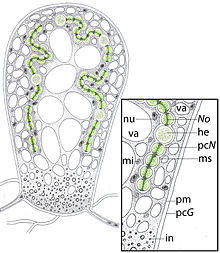 Geosiphon has a specialised bladder used to harbour cyanobacteria, usually Nostoc punctiforme, although other Nostoc species are known to be incorporated by the fungus.[6] Geosiphon bladders are photosynthetically active,[7] and are also capable of fixing nitrogen from the atmosphere.[8] The walls of the bladder have a small pore radius (approximately 0.5 nm), which make it act as an osmotic barrier. This limits the free exchange of nutrients (like sugars) with the environment and increases the need to derive these carbon sources from internal sources.[9] It has been suggested that the organization of the symbiotic interface between the fungus and Nostoc in G. pyriforme is homologous to the symbiotic interface between plant and fungus in arbuscular mycorrhiza in terms of thickness, chitin content, and ultrastructure of layers.[10] G. pyriformis however, is not known to form arbuscular mycorrhiza.