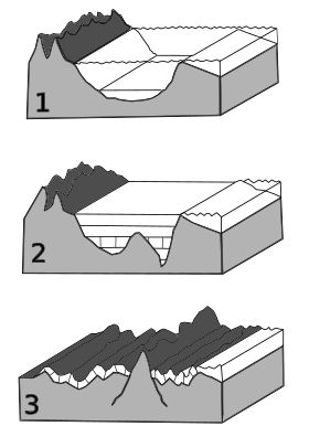 Dana and Stille supposed that the collapse of geosynclines into orogens was result of the Earth's contraction over time.[5] In Stille and Kober's view, geosynclines and orogens were the unstable parts of the Earth's crust, in stark contrast with the very stable kratogens.[12][13] Stille theorized that the contractional forces responsible for geosynclines also formed epeirogenic uplifts, resulting in a pattern of undulation in the Earth's crust. According to this view, regular, episodic global revolutions caused geosynclines to collapse, forming orogens.[13] According to Kober and Stille, developing geosynclinal depressions were accompanied by uplifted geanticlines, which then eroded, providing sediments that filled the geosynclinal basin.[1] According to Stille, geosynclines were formed from crustal folding rather than faulting; if faults were present in geosynclines, they were the product of later processes, such as the final collapse of the geosyncline.[4]